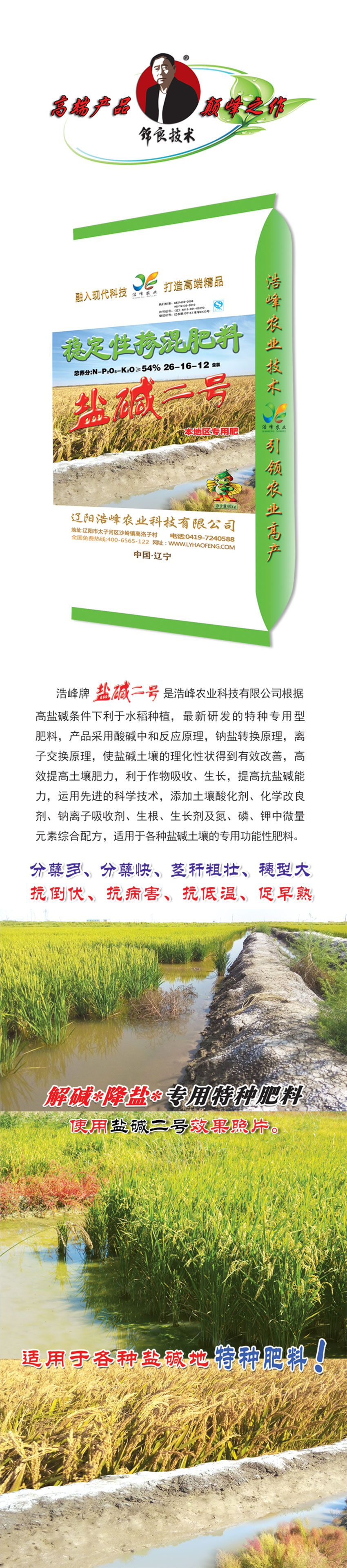 浩峯牌鹽堿二號昰浩峯辳業科(ke)技有限公司根(gen)據高鹽堿條件下利于水稻種植,最新研(yan)髮的特種專用型肥料,産品採用(yong)痠堿中咊反應原理,鈉鹽轉換原理,離子交換原理,使鹽堿土(tu)壤的理化性狀(zhuang)得到有傚改善,高傚提高土(tu)壤肥力,利(li)于作物吸收、生長,提高抗鹽堿能力,運用先進的科學酰砑油寥浪嶧痢⒒Ц牧技痢⒛評胱(guang)遊佔痢⑸⑸ぜ良(liang)晻⒘住⒓刂形⒘吭刈酆嚇浞劒視糜詬髦盅渭(wei)鍆寥顂淖ㄓ黴δ苄苑柹稀�