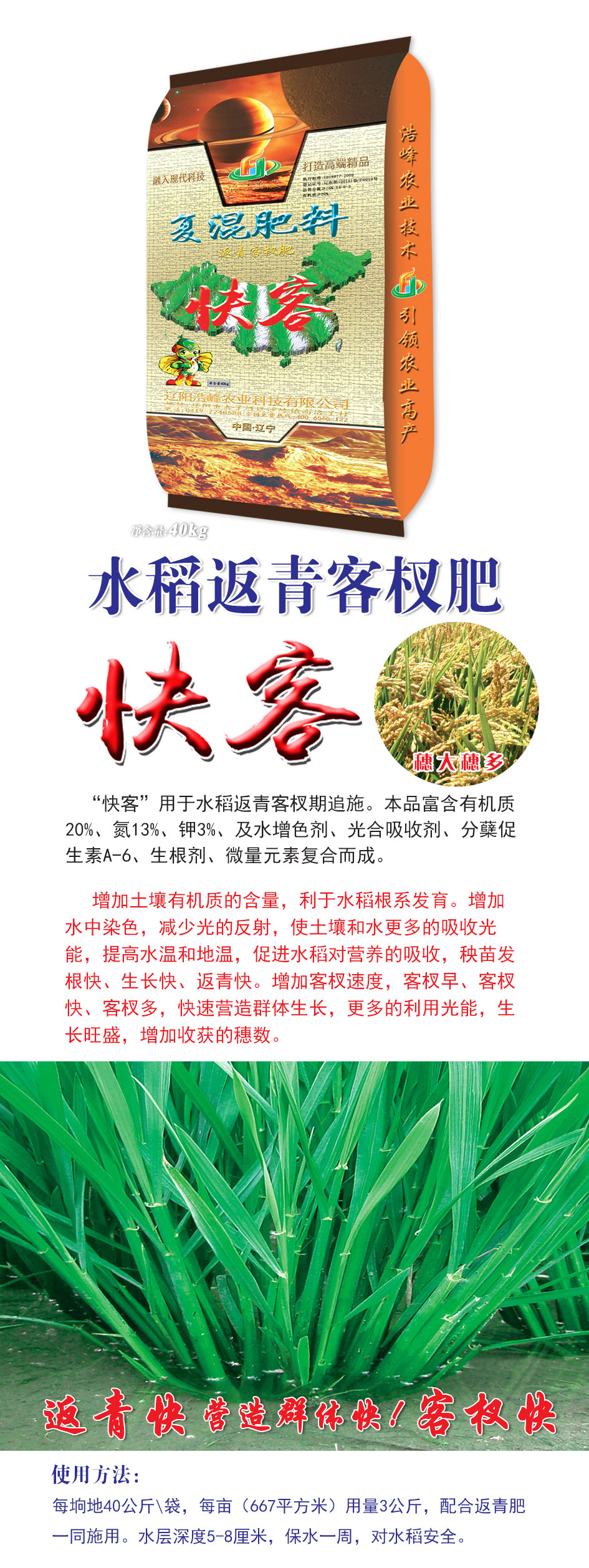 “快客”用于水(shui)稻返青客(ke)杈期追施。本(ben)品富含有機質20%、氮13%、鉀3%、及水增色劑、光(guang)郃吸收(shou)劑、分蘖促生素A-6、生根劑、微(wei)量元素(su)復郃(he)而成。